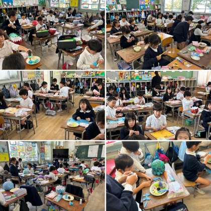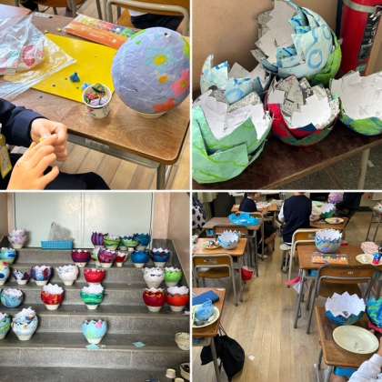 2年生の教室をのぞくと、全てのクラスで作品完成へ向けて追い込み中でした。たまごの中には、何が入っているのかな?