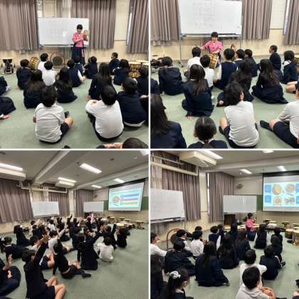 4年生が学習したのは、韓国・朝鮮の楽器です。さまざまな楽器を見せていただき、音を聞かせていただきました。