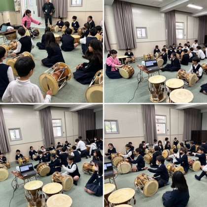 そして、チャンゴとプクという楽器の演奏にチャレンジしました。子どもたちは、見たことがない楽器に興味津々です。ソンセンニムから教えていただいた叩き方でみんなでリズムを合わせて叩き、上手に演奏できていました。
