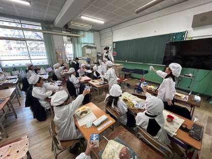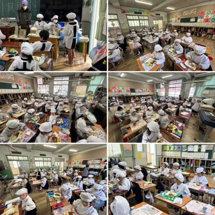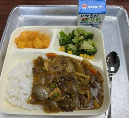 1年生の子どもたちも、しっかりと給食当番をがんばっています。今日は子どもたちの大好きなカレーライスです。野菜もしっかりと食べてくださいね。