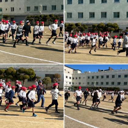 今週と来週は「かけあし週間」です。15分休みに、2,4,6年生と1,3,5年生に分けて実施をしています。運動場のトラックを内側から低、中、高学年にゾーンを分けて5分間走をします。