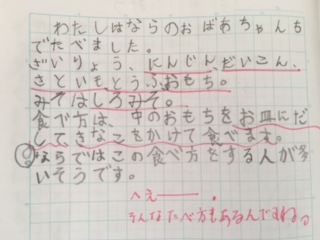 お雑煮に入れる野菜なども家庭によって違うようで、おもしろい発見がありました。3年生が、冬休みの自由勉強で、お雑煮について調べていました。おばあちゃんが住んでおられる奈良方面の食べ方について教えてくれました!