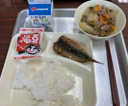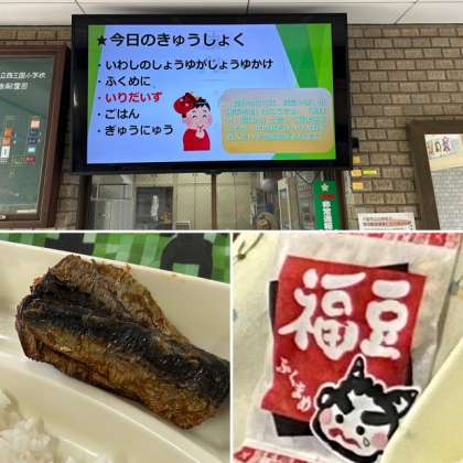 今日の給食は節分の行事献立です。今日の朝会で話をした「いり大豆」と「いわし」が献立に登場です。