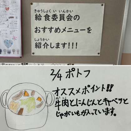 ポトフはフランスの家庭料理の1つです。給食はいろいろな国の料理が食べることができますね。ポトフは給食委員会のおすすめメニューにもなっています。
