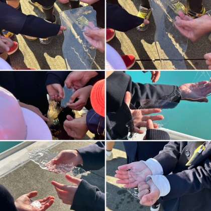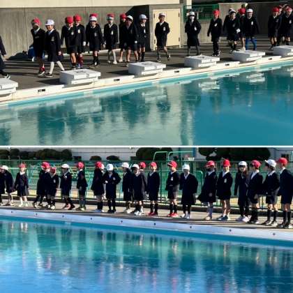 2年生の子どもたちは、それぞれのクラスで氷ついた池とプールの見学をしていました。あまり見ることのない光景に子どもたちは、とても感動していました。氷を手に取って、「でっかい!」「つめたいー!」と口々に声をあげていました。