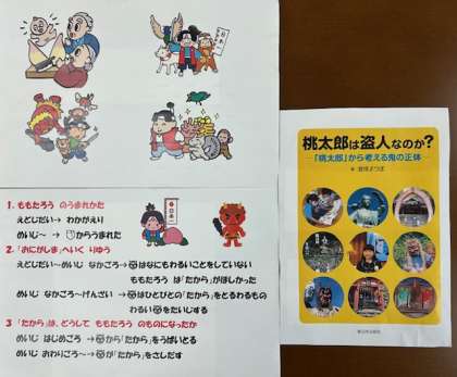 校長の話は、当時小学5年生の倉持よつばさんが書いた「桃太郎は盗人なのか?」という本を紹介しました。桃太郎の話や鬼の正体が時代とともに変わってきたことを本を読んだり、全国の神社を訪れたりして調べたそうです。とても興味深い内容の本になっています。何か知りたいと思ったことがあれば、素直に知りたいという強い気持ちと絶対調べたいという粘り強い気持ちを持って、調べてみましょうという話をしました。