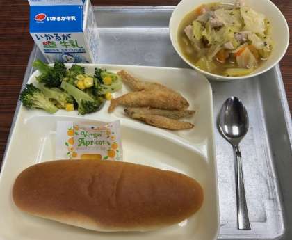 野菜たっぷりのスープ煮とサラダ、カルシウムたっぷりのわかさぎのフライです。栄養たっぷりで美味しい給食です。