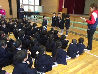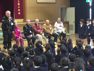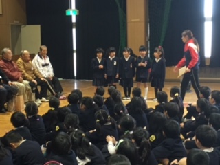 オープニングセレモニーの時間です。各クラスの代表が、はじめの言葉を発表しました。今日の「先生」は、地域の福寿会、友愛会の皆さんで、20名の方お一人お一人のお名前をうかがいました。「とても楽しみにしていました。」とのお言葉に、子どもたちもにっこり。