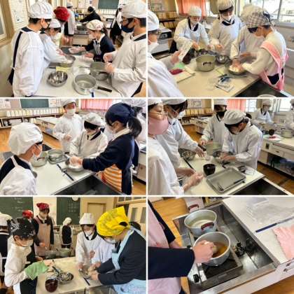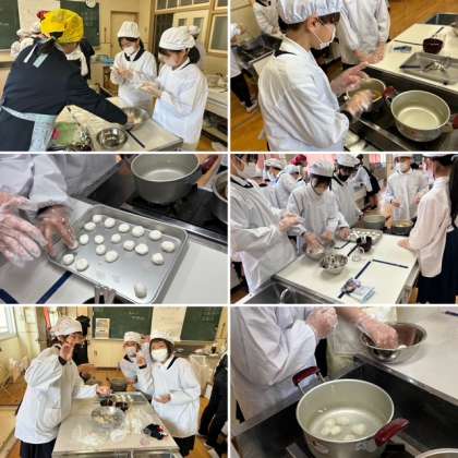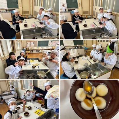 白玉粉に水を加えてこねていきます。3人ぐらいで力を合わせてがんばっているグループもありました。みたらしのあんは、お玉でこげないようにかき混ぜて、上手に作れました。班でよく協力して美味しいみたらし団子の完成です。