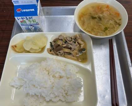 五目汁の野菜は、とても細かくカットされています。調理員さんたちは、とても大変だと思いますが、野菜が苦手な子も食べやすいように調理していただいています。