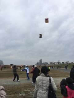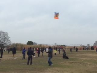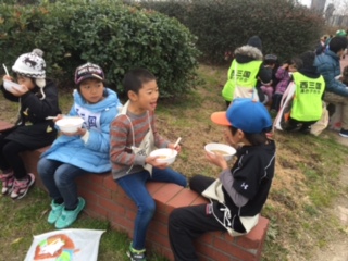 凧揚げの後は、あたたかい豚汁に舌つづみ。体があったまります!最後は、大凧上げです。みんなでロープを引っ張って大きな凧が河川敷の空に舞いました。子ども会を始め、地域の皆様、朝早くからお疲れ様でした。ありがとうございました。