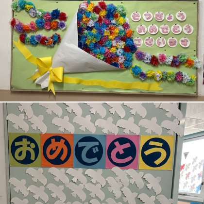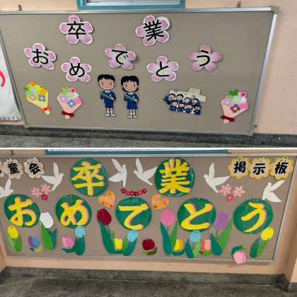 いよいよ卒業式まで1週間となりました。校内いたるところに「おめでとう」の言葉があります。