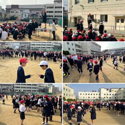 今年度最後の児童集会でした。今日はじゃんけんリレーをしました。A班とB班のじゃんけん対決です。誰でも簡単に取り組めるゲームなので、1年生から6年生まで、みんなで盛り上がりました。