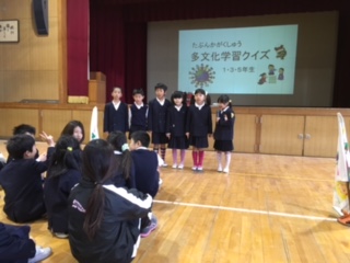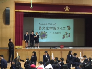 総合的な学習や、社会科、国語科など今まで学習してきたことの中から色々な国や民族についてクイズを作って出しました。今日は、1.3.5年生が担当でした。1年生は、韓国・朝鮮、フランス、サウジアラビアなどの挨拶についてのクイズ、3年生は、ソンセンニムに教えていただいたチヂミや、中国語の食べ物の名前などについて、5年生は、コントも交えながらコリアタウンと、和菓子の中から羊羹についてのクイズを出してくれました。どの学年も学習したことを踏まえて、感想も入れた発表でした。色々な国のことが分かり楽しい集会でした。