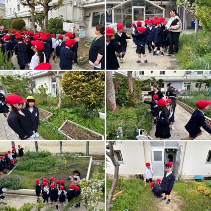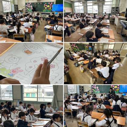 3時間目は、1組は先生のお話をしっかり聞いて、宿題のプリントに名前を書いていました。2組は春のお花を探しに校庭で学習をしていました。