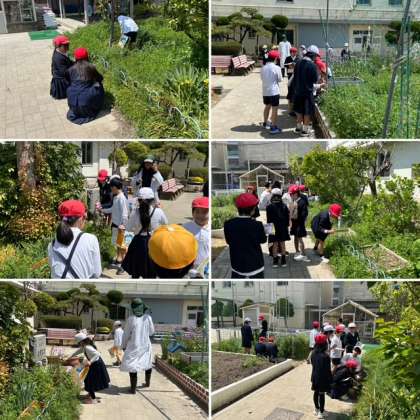 4年生の理科の学習で、校庭で春の植物を探しています。教科書の写真を見ながら、写真と同じ植物を見つけていました。今日は昨日とは打って変わってとても良い天気で、子どもたちは春を感じながら学習をしていました。