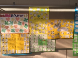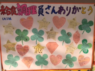 感謝の気持ちを込めて全学年の児童が、メッセージカードにお礼を書きました。「いつも栄養のある給食を作ってくださりありがとうございます。」「ラッキー人参の入ったカレーが大好きです。」「ぼくは、うどんが一番好きです。これからもよろしくお願いします。」などなど。しっかりと味わっていただきましょう^_^
