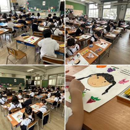 1年生の教室に行ってみると、1組はひらがなの学習をしていました。先生に丸をもらうのに行列ができていました。子どもたちは、先生から大きな丸をつけてもらってとても嬉しそうです。2組は自分の顔の絵を描いています。丁寧に色を塗って上手にかけています。「みて、みて!」と、たくさんの子どもたちが絵を見せてくれました。