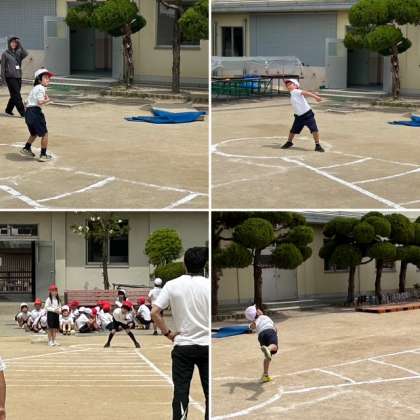 今日は運動場で2年生がソフトボール投げと50メートル走をしていました。ソフトボール投げは1人2回投げます。先生から「もう少し上に向けて投げてみたら」などのアドバイスをもらいながら、力いっぱい投げていました。