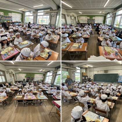 1年生の教室に行くと「きゅうしょく おいしい」と話かけてくる子がいました。1年生は給食をよく食べるようになってきています。今日の人気のメニューは「さけのみそ焼き」でした。たくさんの子どもたちが「お増やし」の手を挙げていました。