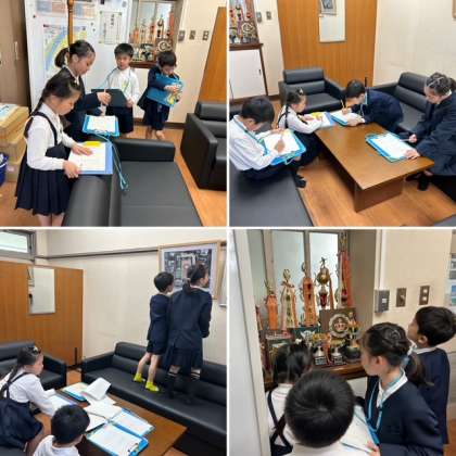 今日は校長室にも4人の子どもたちがインタビューにやってきました。校長先生はどんな仕事をしているのか、放課後は何をしているのか、どうして校長先生になったのかなど、いろいろと質問をしてくれました。たいへんなことはどんなことですか?など、答えるのが少し難しい質問もありました。
