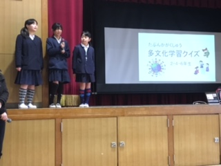 先週に引き続き、多文化学習クイズを行いました。今日は、2.4.6年生からの出題です。2年生は、韓国・朝鮮のありがとうやいただきますなどの挨拶や、日本語とよく似た発音の物を当てるクイズでした。ありがとうやは、2つの言い方どちらも正解というのもあり、みんなびっくり、なるほど!の場面もりました。