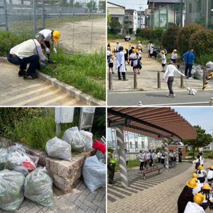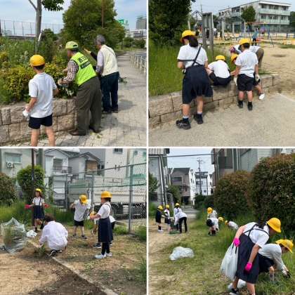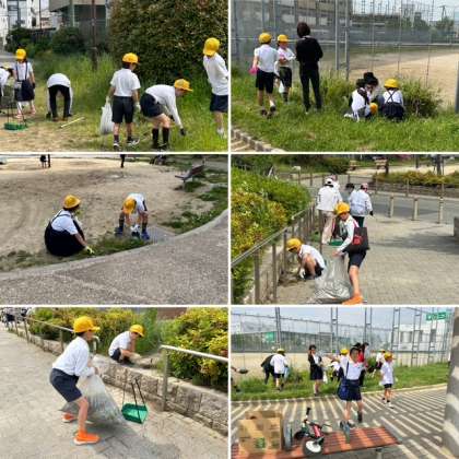 子どもたちが普段利用している公園ですが、いつもは地域の皆さんに清掃をしていただいています。今日は地域の皆さんと力を合わせて、公園をきれいにしました。ポイ捨てされたゴミを拾ったり、雑草を抜いたり、時間いっぱいがんばって掃除をし、たくさんのゴミ袋が山積みになりました。子どもたちは掃除をしながら、地域の皆さんとおしゃべりをして、ふれあいの時間にもなりました。