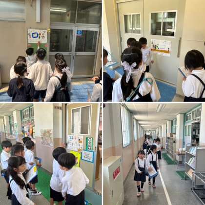 1年生と2年生が学校探検をしました。2年生が1年生を学校のさまざまな場所に案内をして説明をします。少し前から2年生が学校探検の練習をしている姿を見かけましたが、いよいよ本番です。1年生は学校探検をとても楽しみにしていたようです。