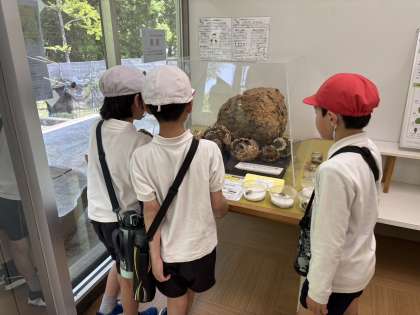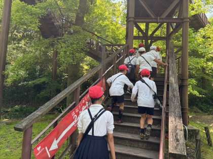 自然観察学習館を見学して、森の空中散歩ができるというソラードという施設で自然観察をしています。
