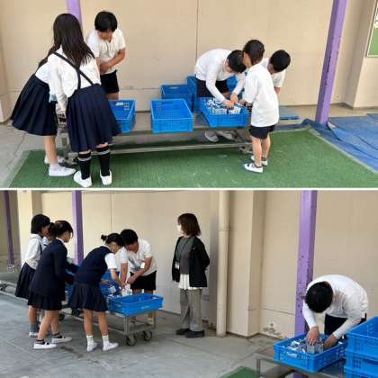 給食の片づけでは、給食委員会の子どもたちが返却された牛乳パックの整理をしています。手早く動いていて助かります。ありがとう!