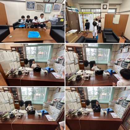 2年生は国語の学習で「はたらく人に話を聞こう」という学習をしています。前回も話を聞きに来た子どもたちがいますが、今日は別のクラスの子どもたちが校長室にやってきました。