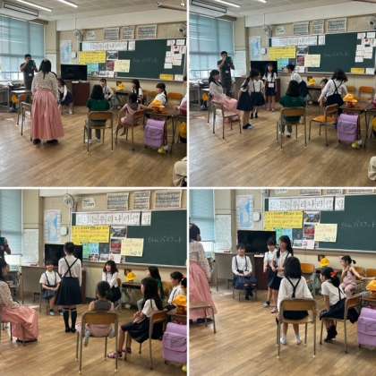 かわいいチマチョゴリを着た子どもたちは、いつもより少し緊張した様子で座っています。民族講師の「ソンセンニム」から、今年も楽しく活動していきましょうとお話があり、一人ずつ自己紹介をしました。