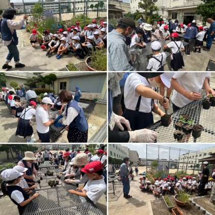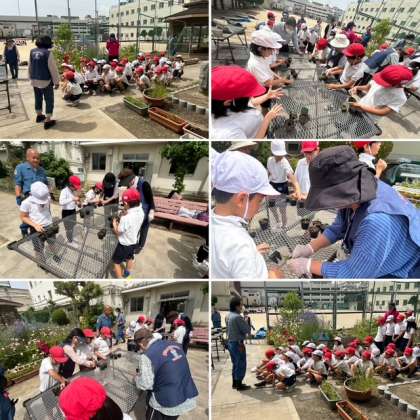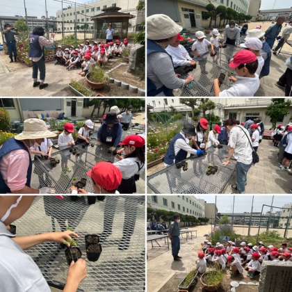 説明を聞いて、花苗ボランティアの皆さん、十三公園事務所の皆さんと一緒に苗の移し替えを行いました。地域の皆さんから「とても上手にできたね」と褒めていただき、子どもたちは嬉しそうです。