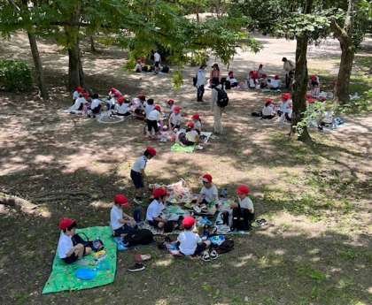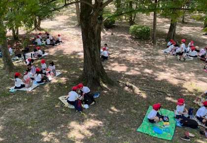 たくさん遊んで、お腹ぺこぺこです。お楽しみのお弁当タイムです。木の陰の涼しいところで、みんな仲良くお弁当を食べています。