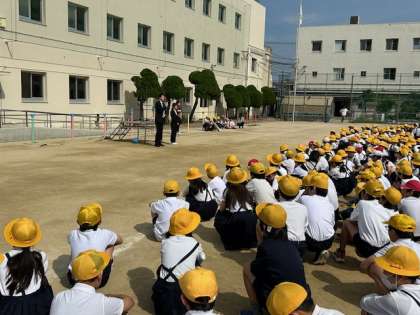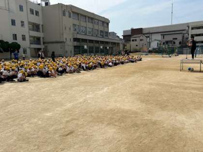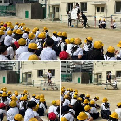6月になりました。よく晴れて気持ちの良い朝です。今日の朝は全校朝会を運動場で行いました。