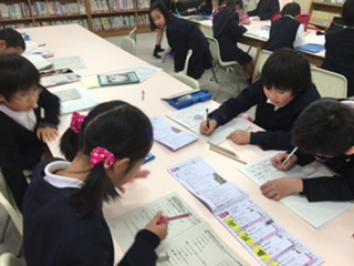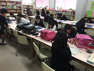 たくさんの子どもたちが、放課後図書室に集まって、宿題や自主学習、どくしよなどをしています。わからないときは、ボランティアさんが、やさしく教えてくださっています。