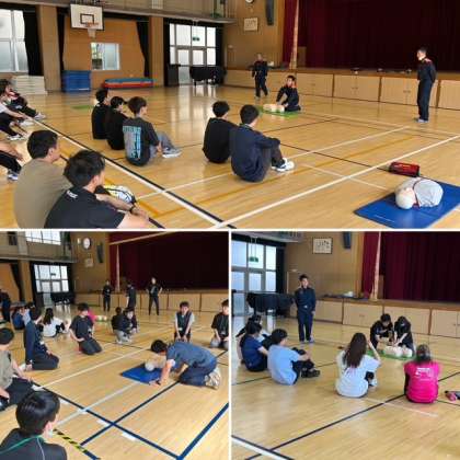 教職員の研修として、淀川消防署の方に来ていただいき、心配蘇生とAEDについて実習を行いました。