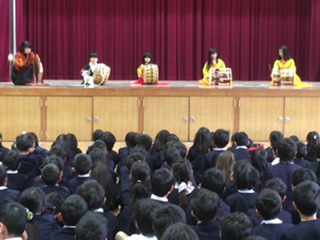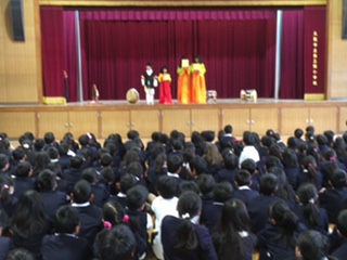 児童集会では、多文化学習の一環として先々週からいろいろな国について学んだことを全学年が。クイズ形式で発表してきました。今朝は、民族クラブの子どもたちが、韓国・朝鮮の食べ物の名前を紹介し、チャンゴなどの演奏をしました。