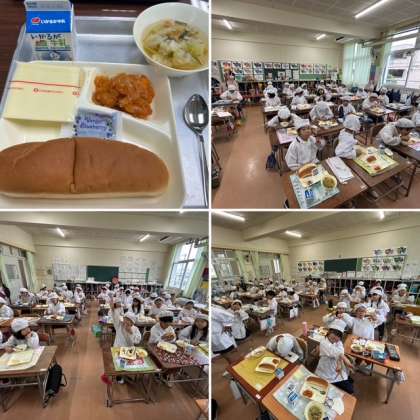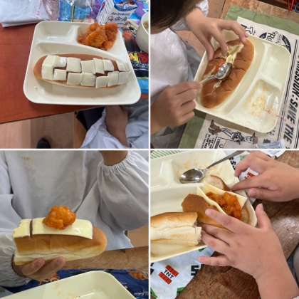 品数豊富な献立となりましたが、子どもたちはチーズをどのようにして食べるかなと思い、3年生の教室で見てみました。きれいにパンの上にチーズを並べている子、チーズとともにえびチリをパンにはさんでいる子、いろいろと工夫をするの