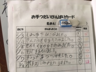 お手伝いカードを見せてもらいました。いろいろなお手伝いを頑張っていますね!連絡帳もさっと書けるようになりました。