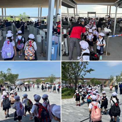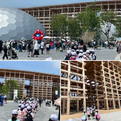 大屋根リングやミャクミャクを見て、子どもたちの気分も盛り上がってきています。