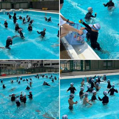 水中ダンスやだるま浮きなどで水慣れをしていきました。そして、潜ったり、浮いたりして遊びの要素を入れながら水泳の基本的な動作の練習をしていきました。