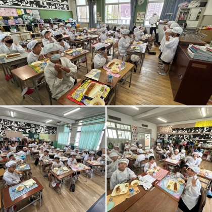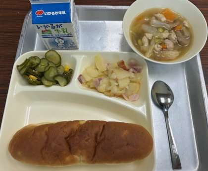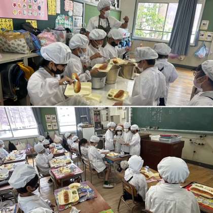 2年生の教室では、当番の子どもたちが自分たちで給食準備をしていました。ずいぶん成長しましたね。