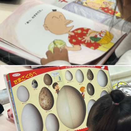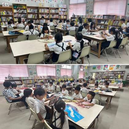 1年生の図書の時間です。みんな静かに本を読んでいます。絵本や児童書など、みんなそれぞれ好きな本を選んで読んでいます。本は、ワクワクする気持ちになれたり、新しい知識を増やしたりできます。また、たくさんの言葉を覚えたり、考える力がついたりもします。