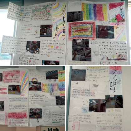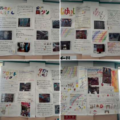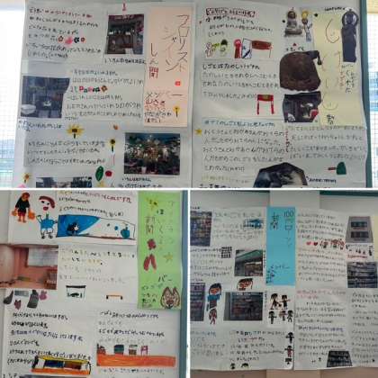 2年生の教室前の廊下には、先日行った地域探検をまとめた壁新聞が掲示されています。かわいいイラストや2年生の子どもたちなりに感じたことをまとめています。
