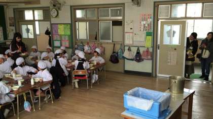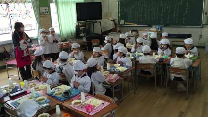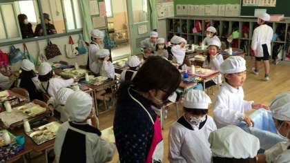 給食の時間から保護者の方に見ていただいています。給食にはサンマのみぞれかけが出ています。骨を上手にとりながらおいしく食べています。
