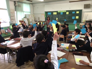 総合的な学習での参観です。2つの項目のどちらがよいか、選択をし、グループディスカッションをします。理由もきちんと分かるように説明します。みんなの発表を聞いて、考えを深め、全体の場での発表です。いろいろな意見を聞いて、考えが変わった子、変わらないけれど、立ち止まって考えることができた子がいました。自分と違ういろいろな考え方があることを知る機会となりました。