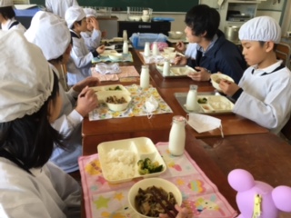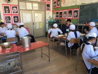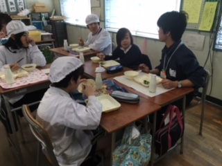 給食の時間もお一人ずつ各学級に入って一緒に食べていただきました。音楽の話だけでなく、映画の話やだいがくの勉強のことなどを話題にし、和やかなひと時でした。