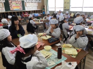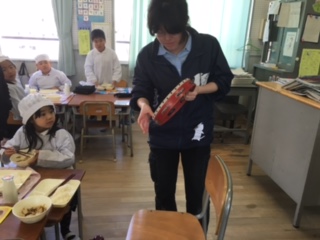 鑑賞会の時に、タンバリンのならしかたを教えてもらいました。それを給食の時間でもやって見せてくださいました。真似をして子ども達も挑戦しました!