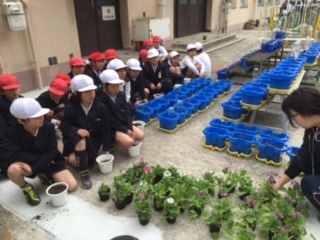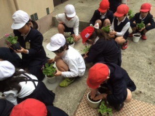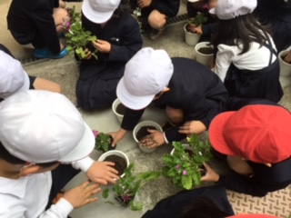 植えました。1人一鉢、大切に育てます。卒業式、入学式の頃、花いっぱいになあれ!